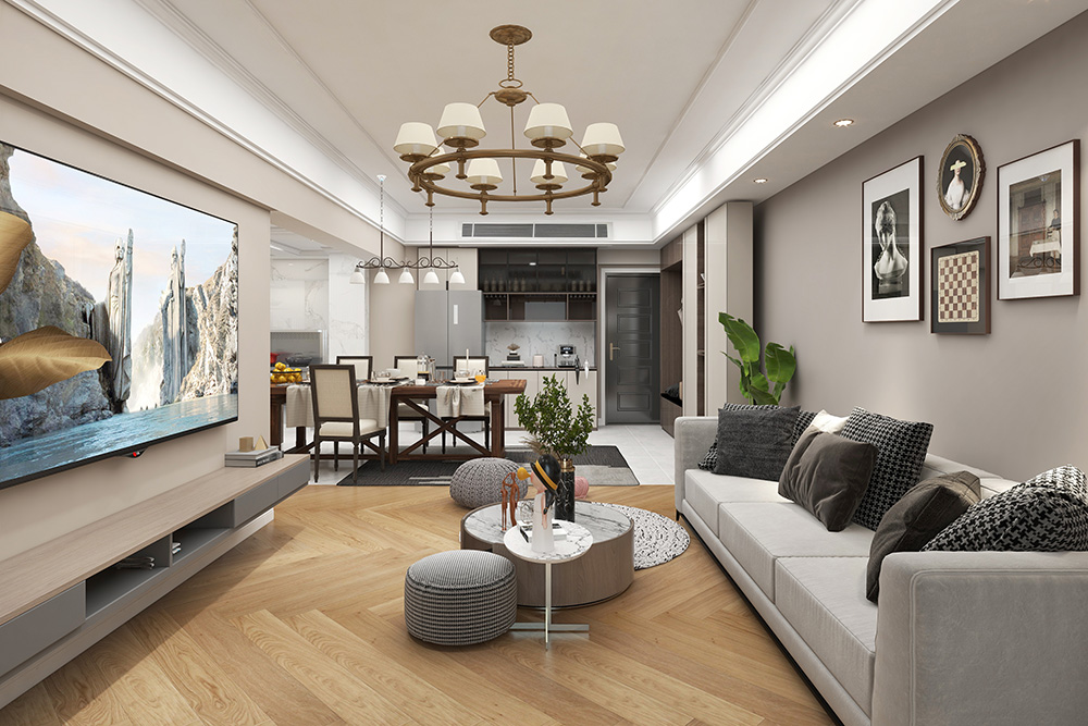 本案戶型為:3室2廳1衛,總面積108㎡,以紳士灰為視覺主線,清冷典雅卻豐盈柔軟的空間,線條與紋理進行著理性而有序的輸出,為空間注入低調而簡雅的品質與意蘊,營造出一種屬于現代人的優雅與高級空間感。