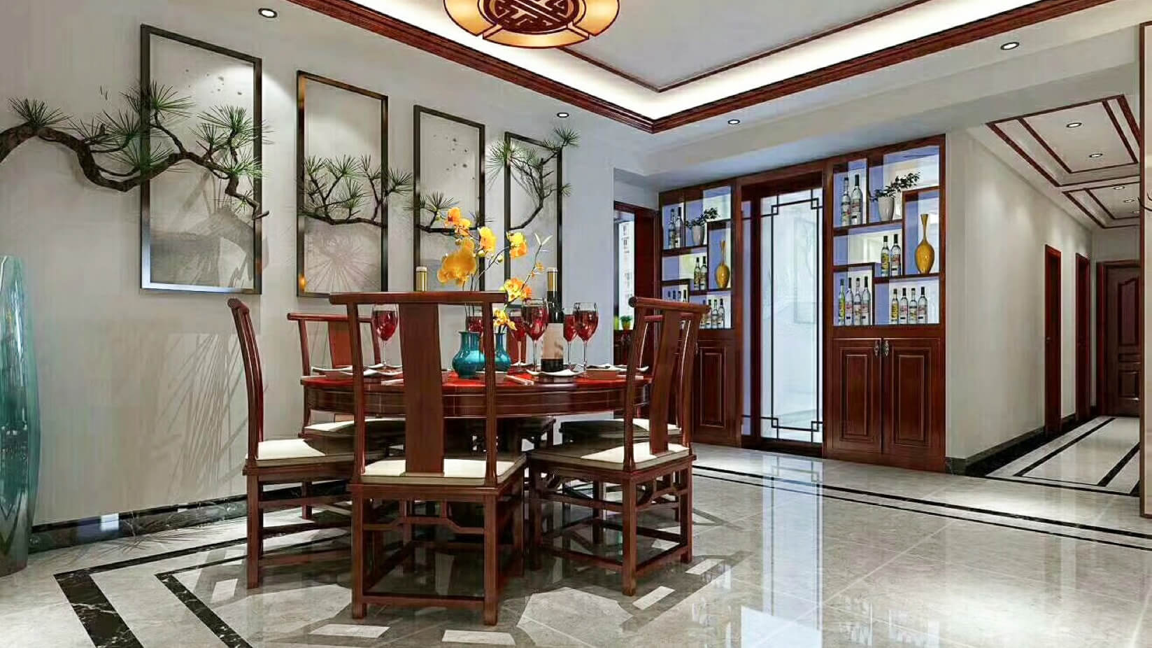 本方案是一家四口設計,業主對中式風格情有獨鐘,所以都是圍繞著中式元素來設計。家里邊經常會客,入戶玄關以及客餐廳的設計要求相對要大氣,客餐廳吊頂采用連貫式的,設計了一級邊吊和實木木線條,與地面的波導線形成相呼應的設計。