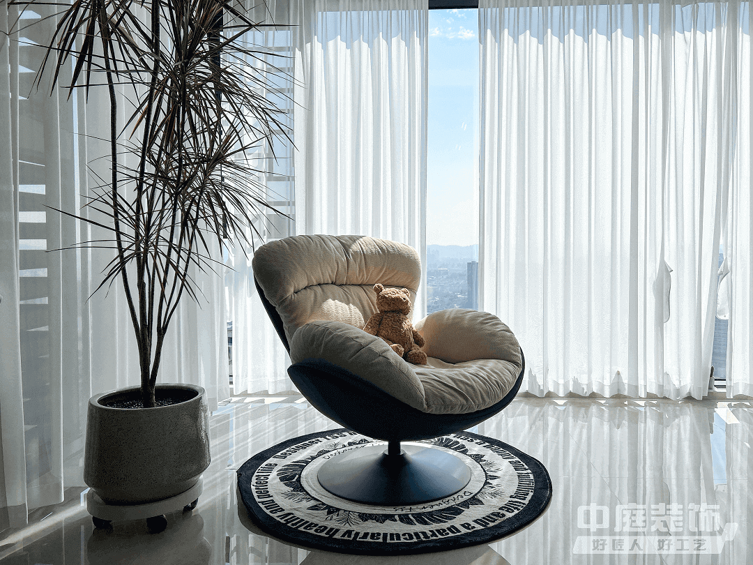 陽(yáng)臺(tái):為了不浪費(fèi)南面的湖景,規(guī)劃開(kāi)放式陽(yáng)臺(tái),用以解決洗衣和收納雜物的問(wèn)題,放上躺椅休息時(shí)直面一片風(fēng)景,身心舒暢。