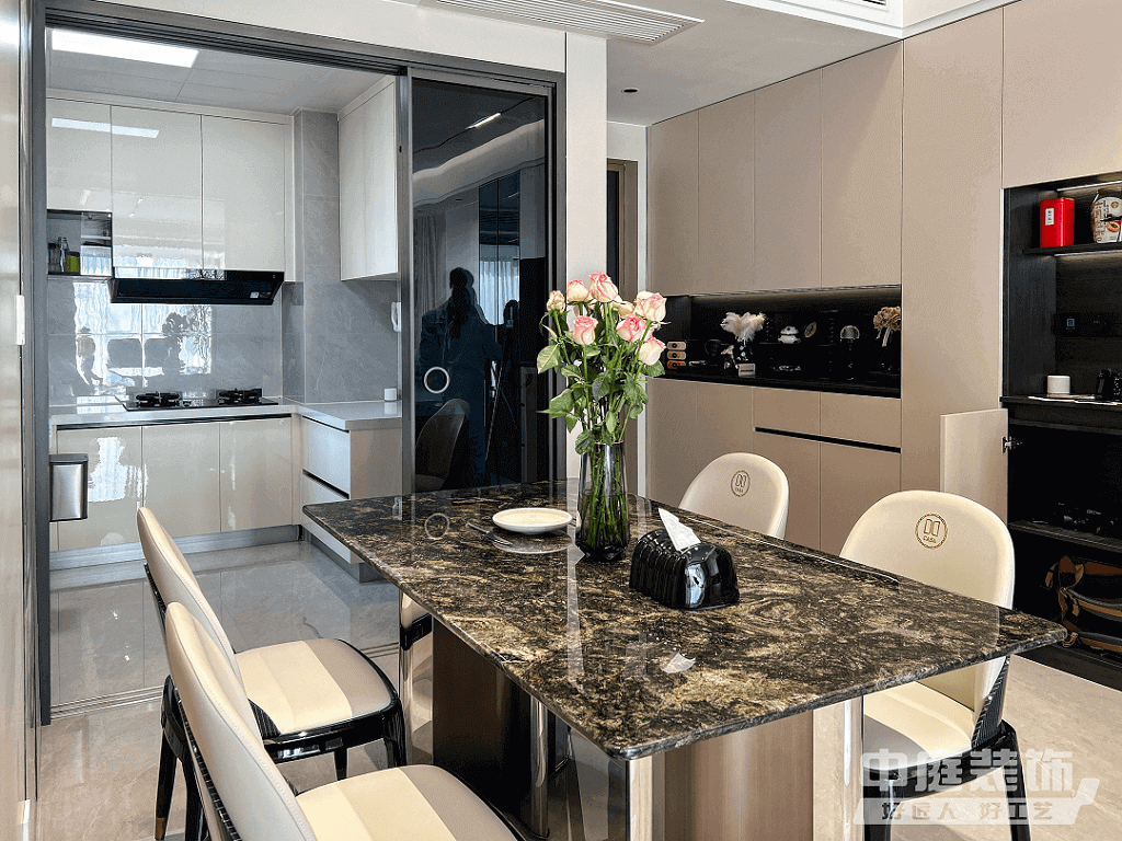 餐廳:開(kāi)放廚房與餐廳結(jié)合,形成餐、廚一體空間。所有廚房電器嵌入式設(shè)計(jì),并按照業(yè)主烹飪習(xí)慣布置,保證操作動(dòng)線便捷、合理。