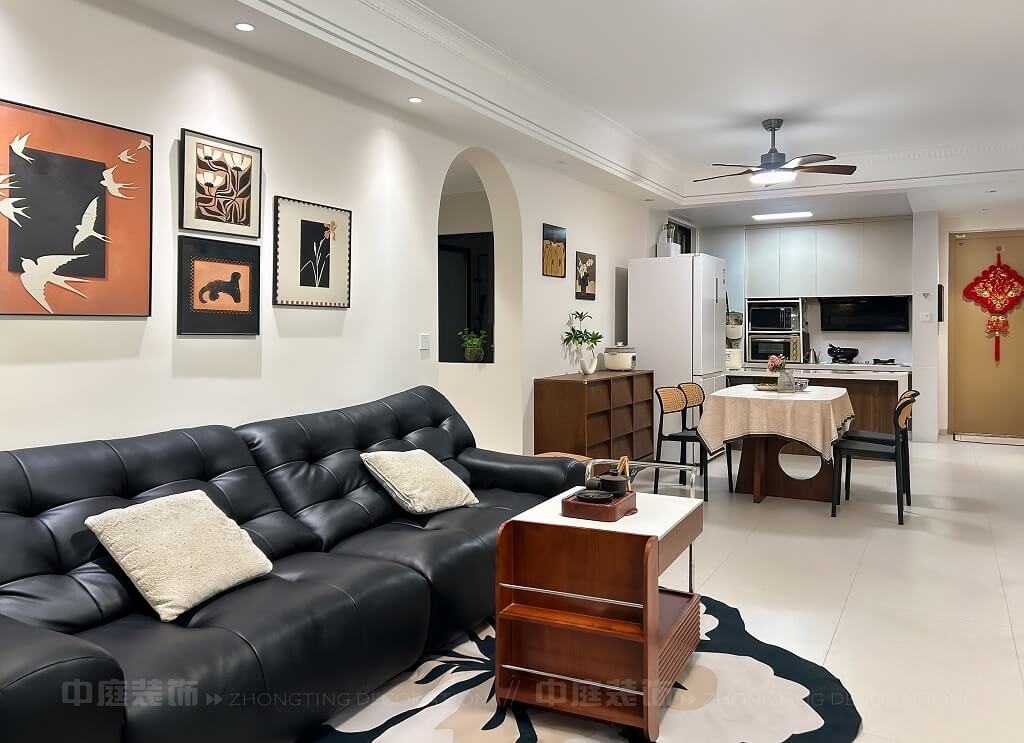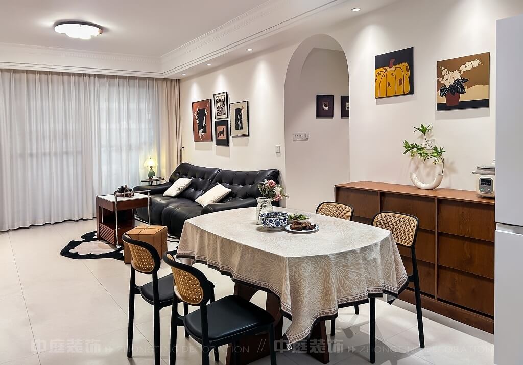 整體空間通過(guò)燈光設(shè)計(jì)、材質(zhì)搭配(皮質(zhì)、木質(zhì)、藤編等),營(yíng)造出舒適且富有格調(diào)的居住氛圍,細(xì)節(jié)處的裝飾畫(huà)、綠植、中國(guó)結(jié)等元素,提升了空間的藝術(shù)感與生活氣息。復(fù)古與現(xiàn)代碰撞的家,每一處都戳中審美點(diǎn)!