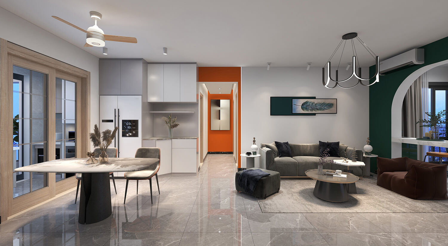 本案例戶型為:3房1廳1衛,總面積125㎡。這是一套輕奢風格的房子。設計師采用開放式布局,將客廳、餐廳融為一體。這樣不僅增加了家庭成員的互動和交流,也可以讓房間看起來更加寬敞。輕奢金屬飾品與布藝沙發的結合,使得畫面具有時尚感又不乏溫馨。