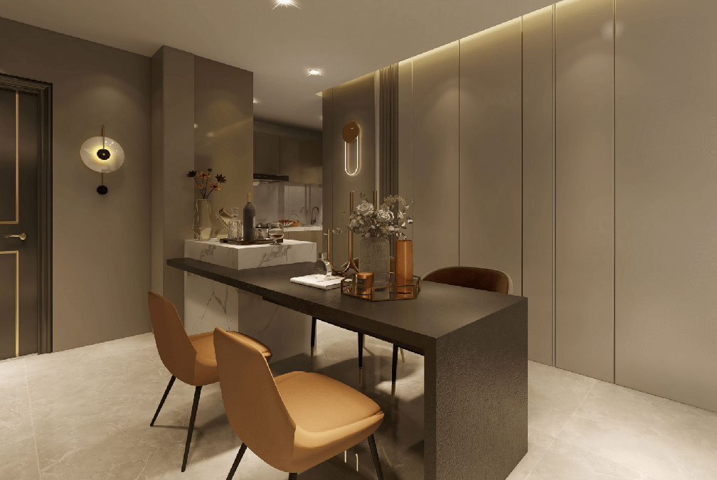 輕奢風格的空間以金屬、皮革的中性色調為主,用色彩的純度傳遞細膩的質感。
