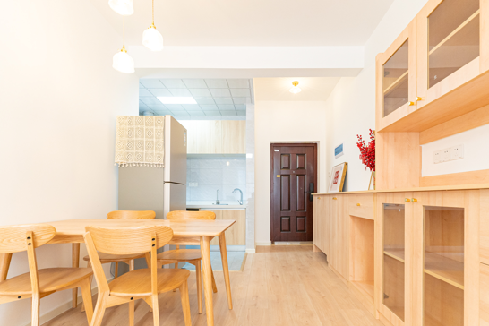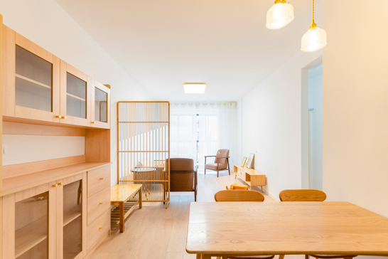 整個(gè)空間基于原木風(fēng)格上做搭配,陽(yáng)臺(tái)打通,解決不互通的采光問(wèn)題,天氣陰晴,都可以為空間做天然點(diǎn)綴;開(kāi)放式廚房和餐廳可以共享操作,互不干擾,又可以加強(qiáng)家人之間的互動(dòng)性提高家庭的幸福感。