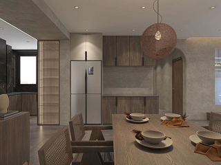 整體風格走向為侘寂風,還原生活的樸素與寧靜,這個戶型的痛點是廚房過小,入戶沒有玄關,且采光差。設計把原有廚房往外擴,與原有入戶形成有序的一體動線。開放式廚房,嵌入式冰箱巧妙設計與原有柱子融為一體。