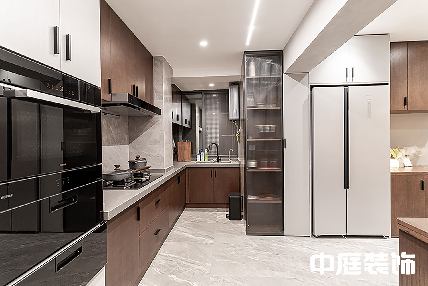 設計開放式廚房,西廚邊安置嵌入式冰箱,空間秩序的重組,讓餐廚區域更顯開闊,實木櫥柜的顏色更顯深韻,越看越有其中味道。長虹玻璃門式的酒柜參與中西廚之間,廚房舍棄以往的扣板吊頂,轉用石膏板吊頂,筒燈代替。在這里,總歸要卸下一身疲憊,與生活默然對話。